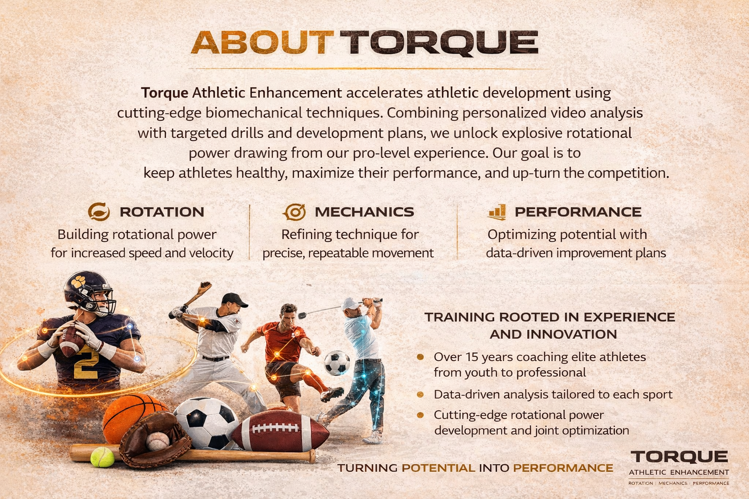 Torque Athletic Enhancement is a biomechanics-driven performance platform specializing in dynamic torque, rotational mechanics, and sequencing efficiency.